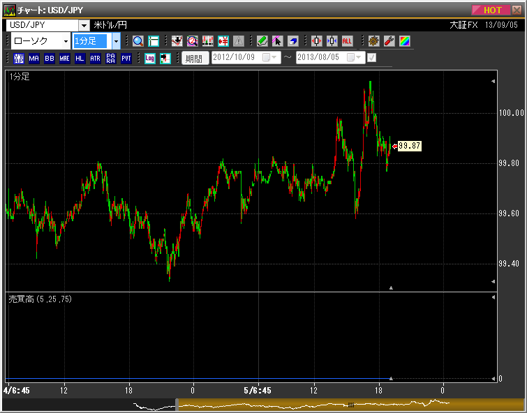 写真はドル円の1分足チャート。13時以降、急騰と急落が続いているが、こうした波に乗るのは至難の技だ。