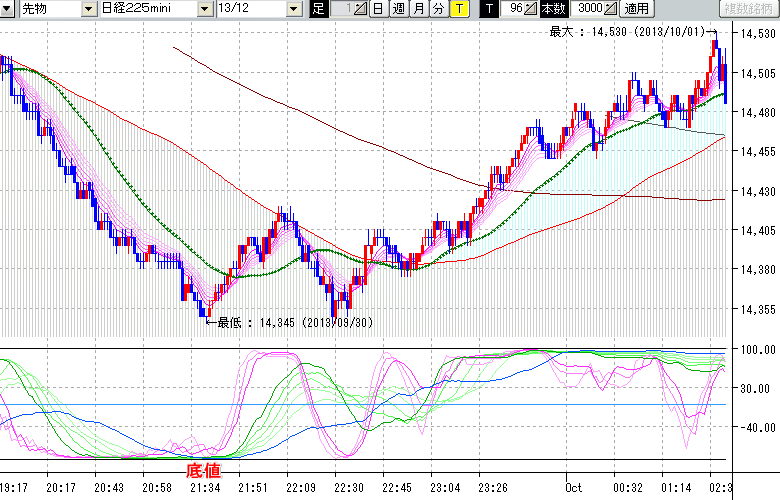 2013/10/01 - tensokoさんの株式ブログ。タイトル:「★9/30 夜間の株価の底値★」 本文:★9/30 夜間の株価の底値★ ↓クリックで画像拡大↓ ※指標ラインの密集点が天底・転換点を示します。指標の見方日経225mini先物チャート : 96ティック足底値 : 14345(9/30