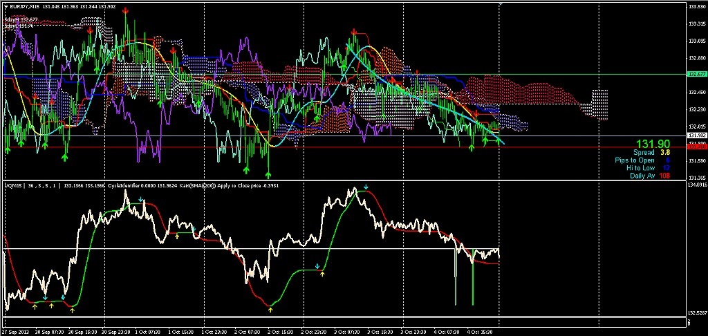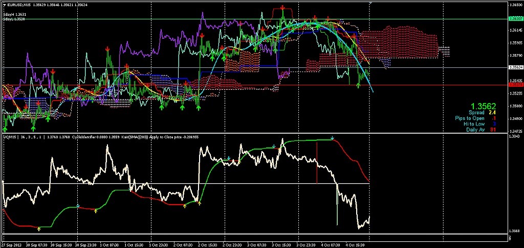 2013/10/07 - けろけろさんの株式ブログ。タイトル:「FX 2013-10-07 15分足」 本文:昨日までの動き左から (チャートの時間は7時間程度遅れてます)--ユーロドル-- --ユーロ・円--