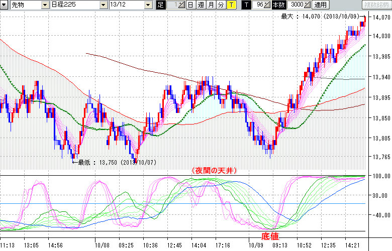 2013/10/09 - tensokoさんの株式ブログ。タイトル:「★10/9 日中の株価の底値★」 本文:★10/9 日中の株価の底値★ ↓クリックで画像拡大↓ ※指標ラインの密集点が天底・転換点を示します。指標の見方日経225large先物チャート : 96ティック足底値 : 13760 (10/9