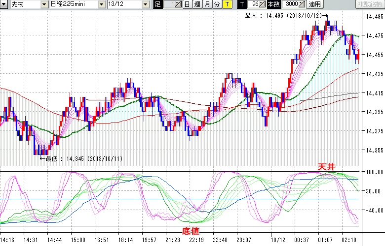 2013/10/12 - tensokoさんの株式ブログ。タイトル:「★10/11 夜間の株価の天底★」 本文:★10/11 夜間の株価の天底★ ↓クリックで画像拡大↓ ※指標ラインの密集点が天底・転換点を示します。指標の見方日経225mini先物チャート : 96ティック足底値 : 14396 (10/11