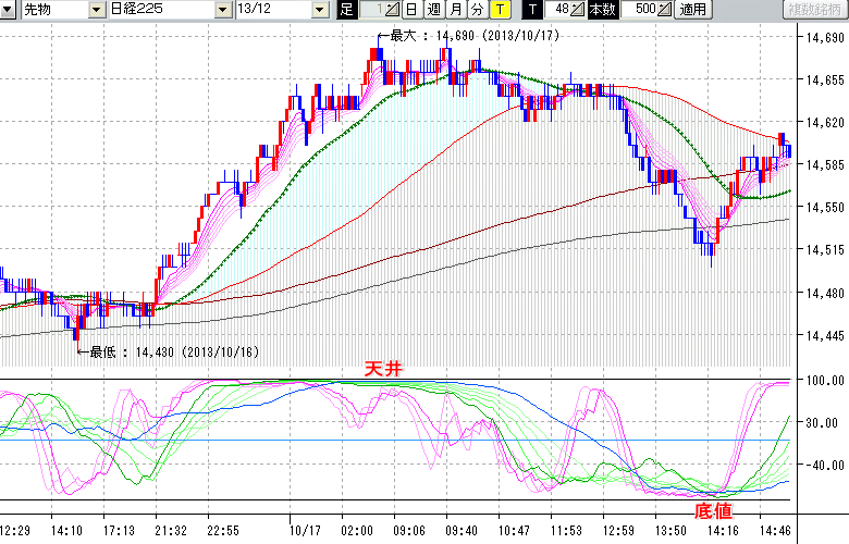 2013/10/17 - tensokoさんの株式ブログ。タイトル:「★10/17 日中の株価の天底★」 本文:★10/17 日中の株価の天底★ ↓クリックで画像拡大↓ ※指標ラインの密集点が天底・転換点を示します。指標の見方日経225large先物チャート : 48ティック足天井 : 14685 (10/17