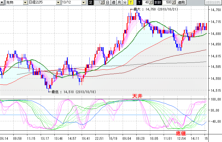 2013/10/21 - tensokoさんの株式ブログ。タイトル:「★10/21 日中の株価の天底★」 本文:★10/21 日中の株価の天底★ ↓クリックで画像拡大↓ ※指標ラインの密集点が天底・転換点を示します。指標の見方日経225large先物チャート : 48ティック足天井 : 14750 (10/21
