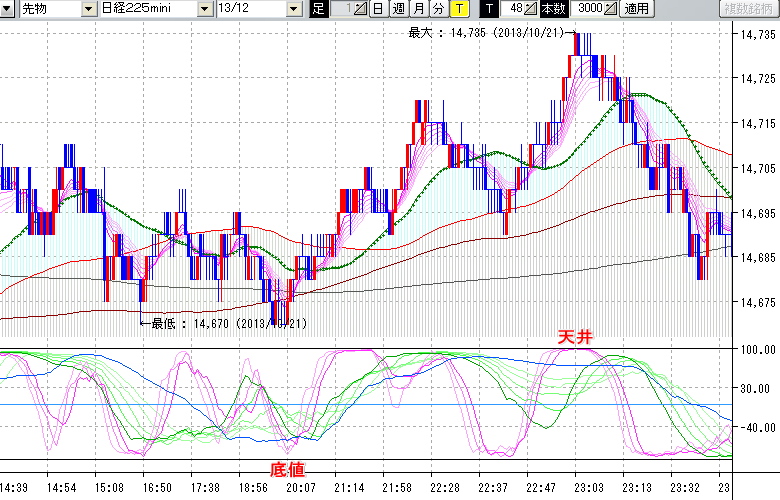 2013/10/22 - tensokoさんの株式ブログ。タイトル:「★10/21 夜間の株価の天底★」 本文:★10/21 夜間の株価の天底★ ↓クリックで画像拡大↓ ※指標ラインの密集点が天底・転換点を示します。指標の見方日経225mini先物チャート : 48ティック足底値 : 14670 (10/21