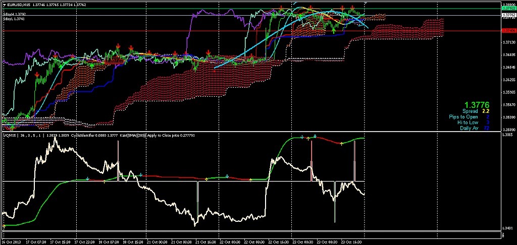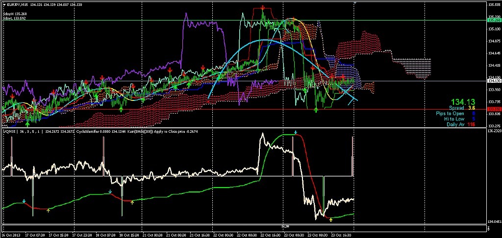 2013/10/24 - けろけろさんの株式ブログ。タイトル:「FX 2013-10-24 15分足」 本文:昨日までの動き左から (チャートの時間は7時間程度遅れてます)--ユーロドル-- --ユーロ・円--