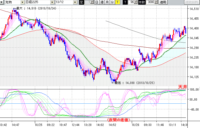 2013/10/28 - tensokoさんの株式ブログ。タイトル:「★10/28 日中の株価の天井★」 本文:★10/28 日中の株価の天井★ ↓クリックで画像拡大↓ ※指標ラインの密集点が天底・転換点を示します。指標の見方日経225large先物チャート : 96ティック足天井 : 14410 (10/28
