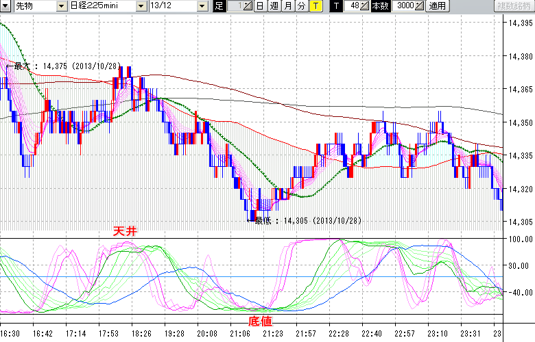 2013/10/29 - tensokoさんの株式ブログ。タイトル:「★10/28 夜間の株価の天底★」 本文:★10/28 夜間の株価の天底★ ↓クリックで画像拡大↓ ※指標ラインの密集点が天底・転換点を示します。指標の見方日経225mini先物チャート : 48ティック足天井 : 14375 (10/29