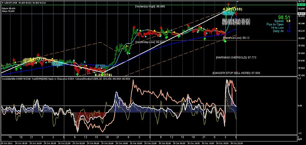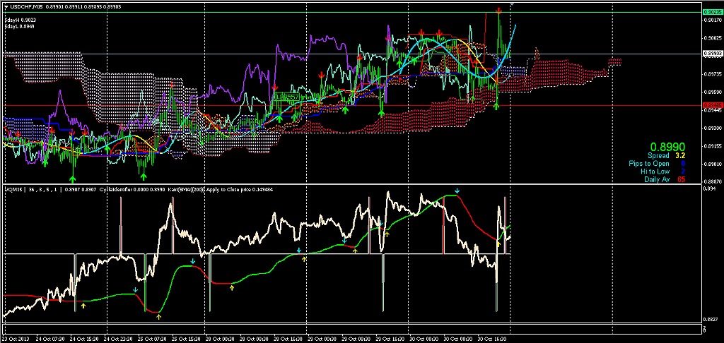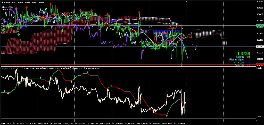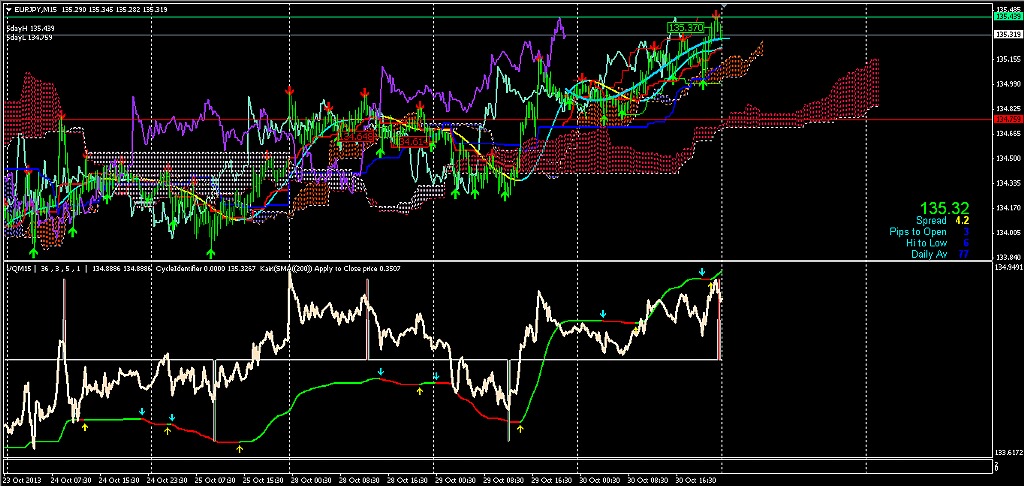 2013/10/31 - けろけろさんの株式ブログ。タイトル:「FX 2013-10-31 15分足」 本文:昨日までの動き左から (チャートの時間は7時間程度遅れてます)--ユーロドル-- --ユーロ・円--