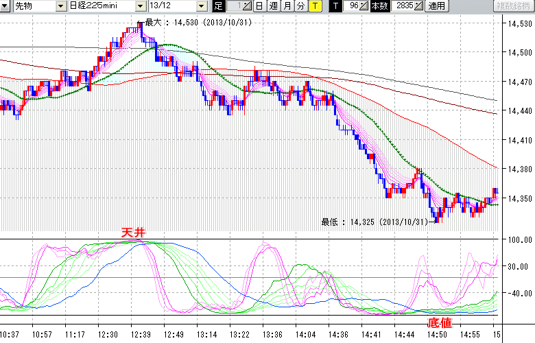 2013/10/31 - tensokoさんの株式ブログ。タイトル:「★10/31 日中の株価の天底★」 本文:★10/31 日中の株価の天底★ ↓クリックで画像拡大↓ ※指標ラインの密集点が天底・転換点を示します。指標の見方日経225mini先物チャート : 96ティック足天井 : 14530 (10/31