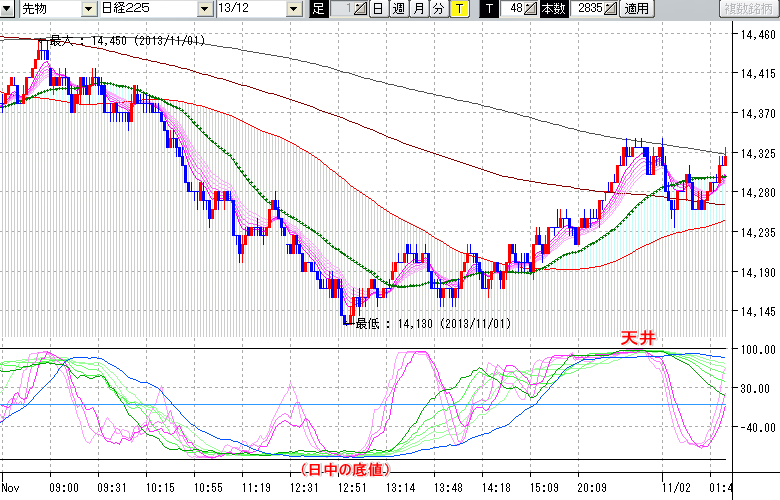 2013/11/02 - tensokoさんの株式ブログ。タイトル:「★11/1 夜間の株価の天井★」 本文:★11/1 夜間の株価の天井★ ↓クリックで画像拡大↓ ※指標ラインの密集点が天底・転換点を示します。指標の見方日経225large先物チャート : 48ティック足天井 : 14340 (11/1