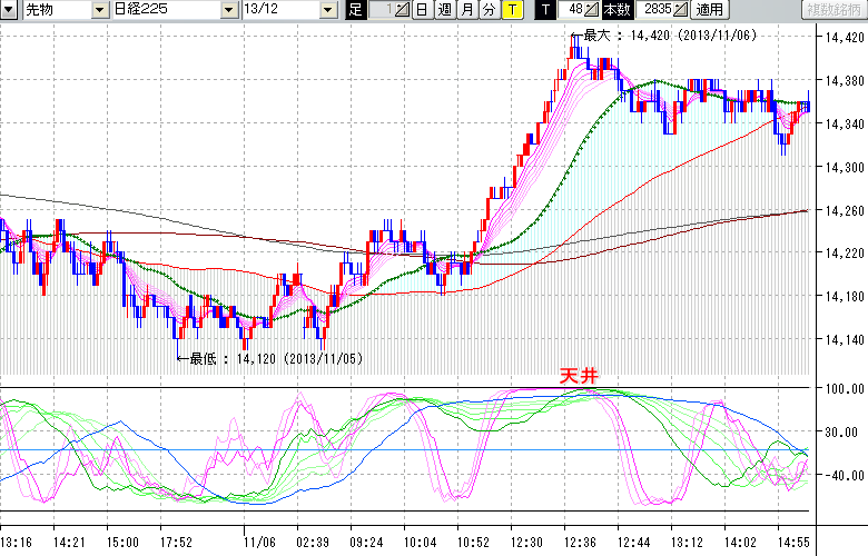 2013/11/06 - tensokoさんの株式ブログ。タイトル:「★11/6 日中の株価の天井★」 本文:★11/6 日中の株価の天井★ ↓クリックで画像拡大↓ ※指標ラインの密集点が天底・転換点を示します。指標の見方日経225large先物チャート : 48ティック足天井 : 14420 (11/6