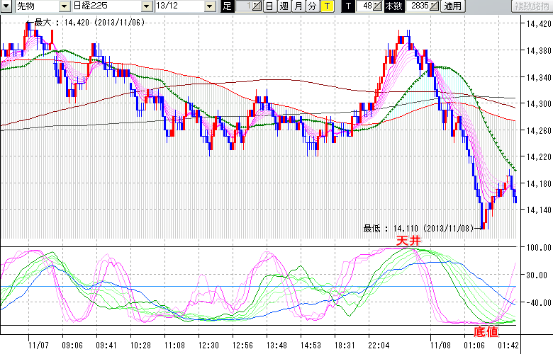 2013/11/08 - tensokoさんの株式ブログ。タイトル:「★11/7 夜間の株価の天底★」 本文:★11/7 夜間の株価の天底★ ↓クリックで画像拡大↓ ※指標ラインの密集点が天底・転換点を示します。指標の見方日経225large先物チャート : 48ティック足天井 : 14410 (11/7