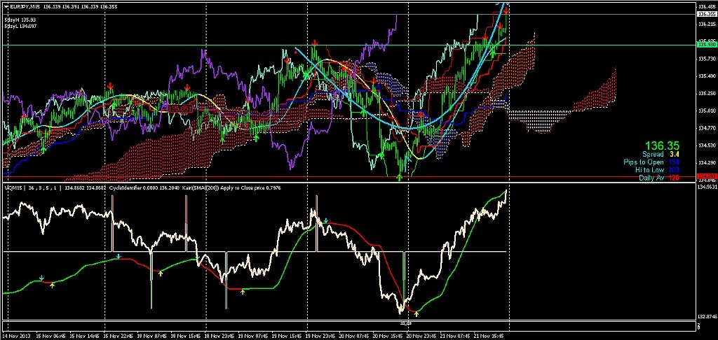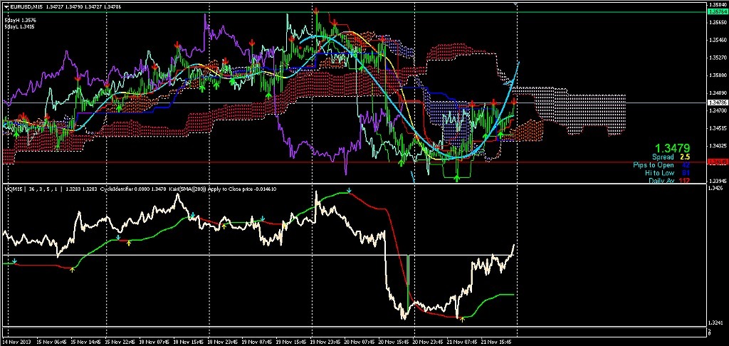 2013/11/22 - けろけろさんの株式ブログ。タイトル:「FX 2013-11-22 15分足」 本文:昨日までの動き左から (チャートの時間は7時間程度遅れてます)--ユーロドル-- --ユーロ・円--