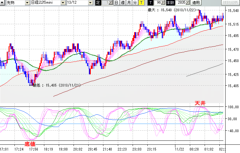 2013/11/22 - tensokoさんの株式ブログ。タイトル:「★11/21 夜間の株価の天底★」 本文:★11/21 夜間の株価の天底★ ↓クリックで画像拡大↓ ※指標ラインの密集点が天底・転換点を示します。指標の見方日経225mini先物チャート : 96ティック足底値 : 15405 (11/21