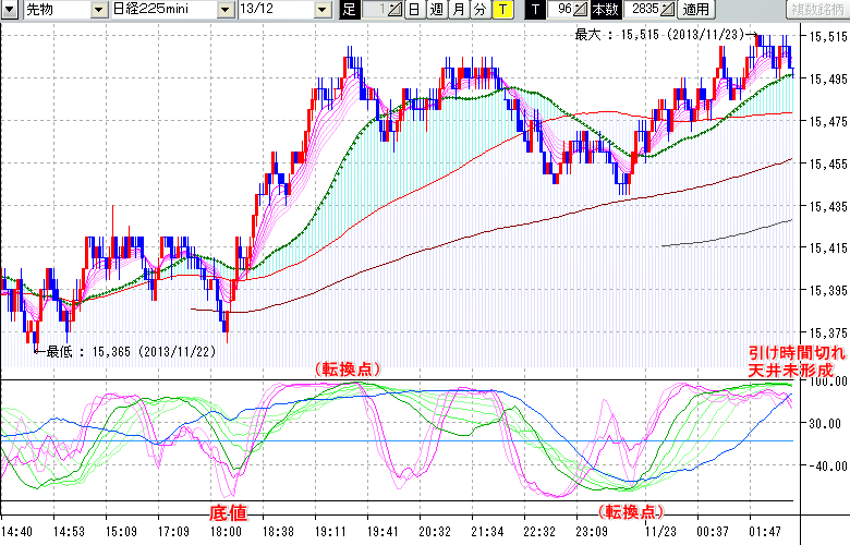 2013/11/23 - tensokoさんの株式ブログ。タイトル:「11/22 夜間の株価の天底★」 本文:11/22 夜間の株価の天底★ ↓クリックで画像拡大↓ ※指標ラインの密集点が天底・転換点を示します。指標の見方日経225mini先物チャート : 96ティック足底値 : 15370 (11/22