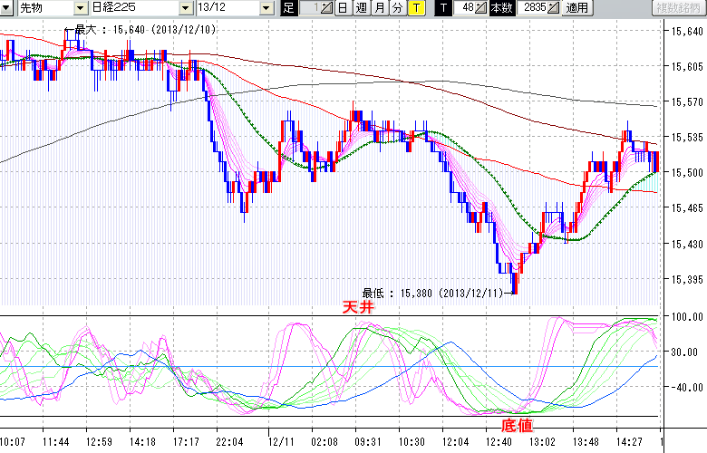 2013/12/11 - tensokoさんの株式ブログ。タイトル:「★12/11 日中の株価の天底★」 本文:★12/11 日中の株価の天底★ ↓クリックで画像拡大↓ ※指標ラインの密集点が天底・転換点を示します。指標の見方日経225large先物チャート : 48ティック足天井 : 15570 (12/11