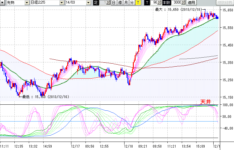 2013/12/19 - tensokoさんの株式ブログ。タイトル:「★12/18 夜間の株価の天井★」 本文:★12/18 夜間の株価の天井★ ↓クリックで画像拡大↓ ※指標ラインの密集点が天底・転換点を示します。指標の見方日経225large先物チャート : 96ティック足天井 : 15650 (12/18