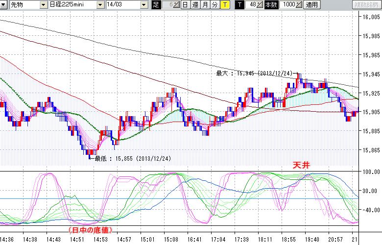 2013/12/25 - tensokoさんの株式ブログ。タイトル:「★12/24 夜間の株価の天井★」 本文:★12/24 夜間の株価の天井★ ↓クリックで画像拡大↓ ※指標ラインの密集点が天底・転換点を示します。指標の見方日経225mini先物チャート : 48ティック足天井 : 15945 (12/24