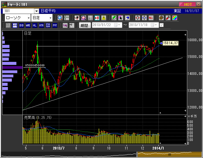 2014/01/07 - 暁投資顧問さんの株式ブログ。タイトル:「平成26年1月7日(火) 雑感」 本文:日経平均株価は続落。昨日は上昇銘柄数が下落銘柄数を上回っており、指数以上に強さを感じる場味だったが今日は総じて弱かった。NT倍率は縮小傾向にあるものの、プットコールレシオは未だ前例がないほど低い水準で