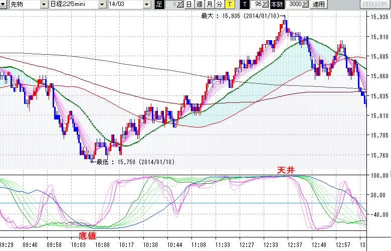 2014/01/10 - tensokoさんの株式ブログ。タイトル:「★1/10 日中の株価の天底★」 本文:★1/10 日中の株価の天底★ ↓クリックで画像拡大↓ ※指標ラインの密集点が天底・転換点を示します。指標の見方日経225mini先物チャート : 96ティック足天井 : 15750 (1/10