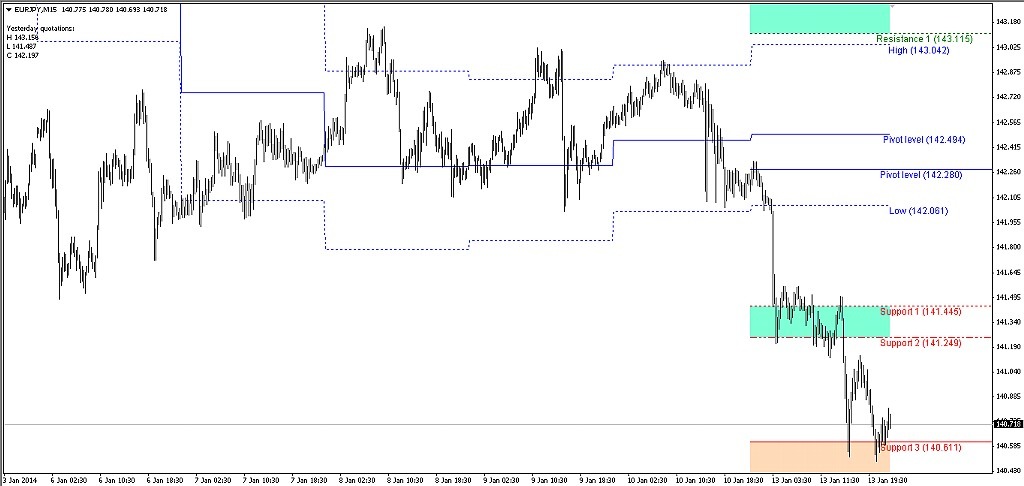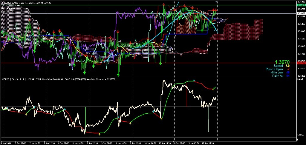 2014/01/14 - けろけろさんの株式ブログ。タイトル:「FX 2014-01-14 15分足」 本文:昨日までの動き左から (チャートの時間は7時間程度遅れてます)--ユーロドル-- --ユーロ・円--