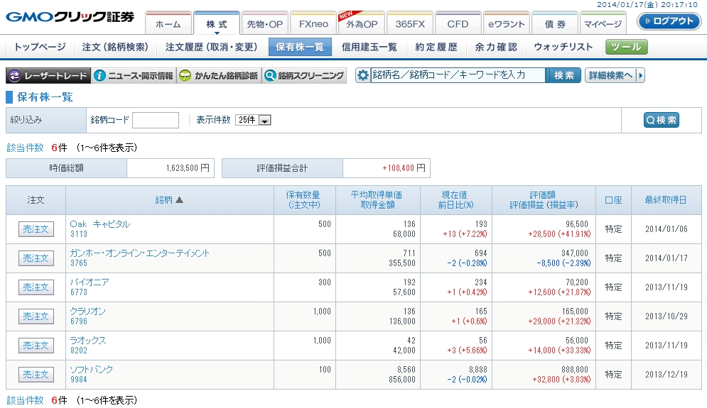 というわけで、日経平均はわずかに下げているものの、市場の雰囲気は悪くなさそうです。東証1部の売買代金は2兆3274億円となっており、17営業日連続での2兆円超とまだまだ意欲は旺盛というか、下がったら買いたいという動きが強いように感じます。NISAも始まっていますし、底で拾いたいという意識が働いているのでしょうか。