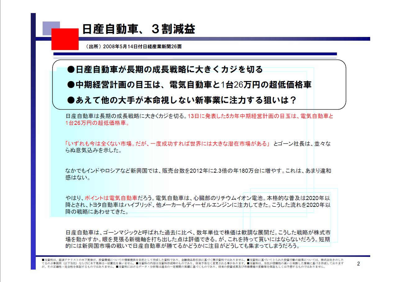 2008/05/15 - 木下 晃伸さんの株式ブログ。タイトル:「【投資脳のつくり方】日産自動車、3割減益」 本文:みなさま、いかがお過ごしでしょうか。 経済アナリスト、木下 晃伸(きのした てるのぶ)です。 決算発表もいよいよクライマックスに差し掛かってきました。