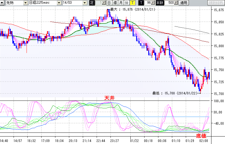 2014/01/22 - tensokoさんの株式ブログ。タイトル:「★1/21 夜間の株価の天底★」 本文:★1/21 夜間の株価の天底★ ↓クリックで画像拡大↓ ※指標ラインの密集点が天底・転換点を示します。指標の見方日経225mini先物チャート : 96ティック足天井 : 15875 (1/21