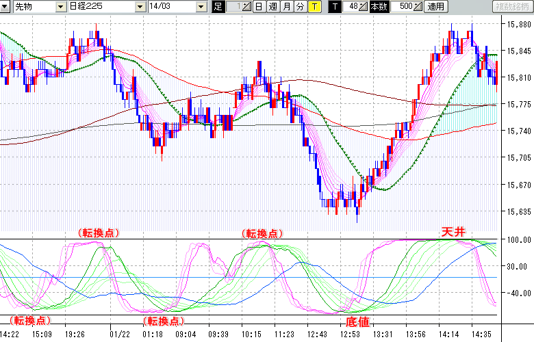 2014/01/22 - tensokoさんの株式ブログ。タイトル:「★1/22 日中の株価の天底★」 本文:★1/22 日中の株価の天底★ ↓クリックで画像拡大↓ ※指標ラインの密集点が天底・転換点を示します。指標の見方日経225large先物チャート : 48ティック足底値 : 15620 (1/22