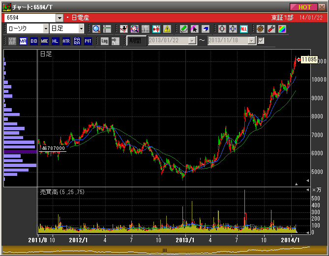 日本電産の月足チャートを見ると、現在上場来高値付近にある。