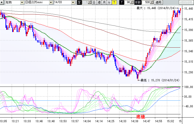 2014/01/24 - tensokoさんの株式ブログ。タイトル:「★1/24 日中の株価の底値★」 本文:★1/24 日中の株価の底値★ ↓クリックで画像拡大↓ ※指標ラインの密集点が天底・転換点を示します。指標の見方日経225mini先物チャート : 96ティック足底値 : 15270 (1/24