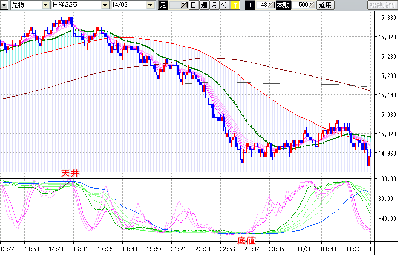 2014/01/30 - tensokoさんの株式ブログ。タイトル:「★1/29 夜間の株価の底値★」 本文:★1/29 夜間の株価の底値★ ↓クリックで画像拡大↓ ※指標ラインの密集点が天底・転換点を示します。指標の見方日経225large先物チャート : 48ティック足天井 : 15380 (1/29