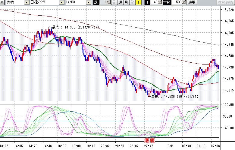 2014/02/01 - tensokoさんの株式ブログ。タイトル:「★1/31 夜間の株価の底値★」 本文:★1/31 夜間の株価の底値★ ↓クリックで画像拡大↓ ※指標ラインの密集点が天底・転換点を示します。指標の見方日経225large先物チャート : 48ティック足底値 : 14580 (1/31
