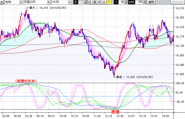 2014/02/05 - tensokoさんの株式ブログ。タイトル:「★2/5 日中の株価の底値★」 本文:★2/5 日中の株価の底値★ ↓クリックで画像拡大↓ ※指標ラインの密集点が天底・転換点を示します。指標の見方日経225large先物チャート : 48ティック足底値 : 13980 (2/5