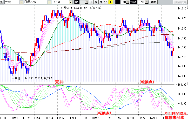 2014/02/06 - tensokoさんの株式ブログ。タイトル:「★2/6 日中の株価の天底★」 本文:★2/6 日中の株価の天底★ ↓クリックで画像拡大↓ ※指標ラインの密集点が天底・転換点を示します。指標の見方日経225large先物チャート : 48ティック足天井 : 14310 (2/6