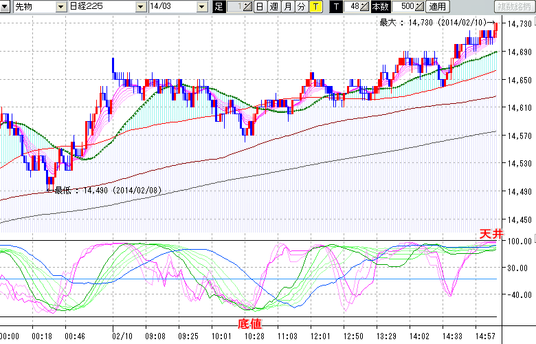 2014/02/10 - tensokoさんの株式ブログ。タイトル:「★2/10 日中の株価の天底★」 本文:★2/10 日中の株価の天底★ ↓クリックで画像拡大↓ ※指標ラインの密集点が天底・転換点を示します。指標の見方日経225large先物チャート : 48ティック足底値 : 14560 (2/10