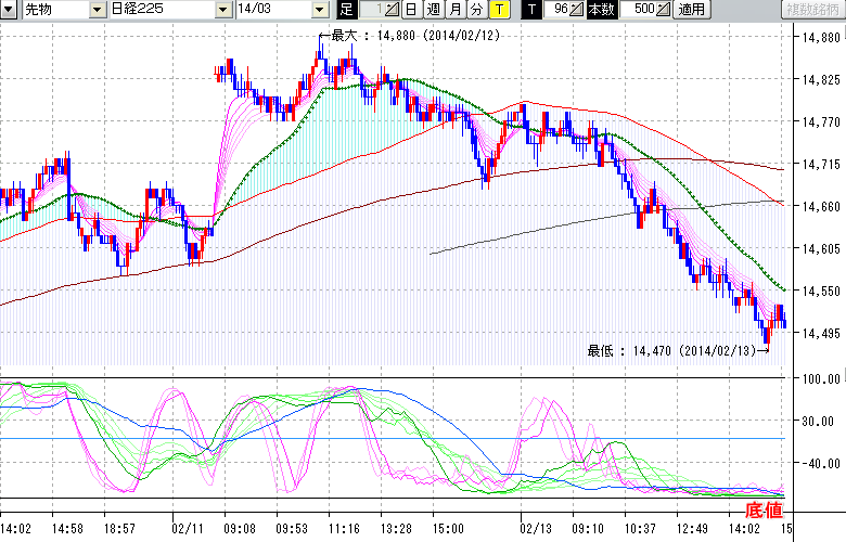 2014/02/13 - tensokoさんの株式ブログ。タイトル:「★2/13 日中の株価の底値★」 本文:★2/13 日中の株価の底値★ ↓クリックで画像拡大↓ ※指標ラインの密集点が天底・転換点を示します。指標の見方日経225large先物チャート : 96ティック足底値 : 14470 (2/13