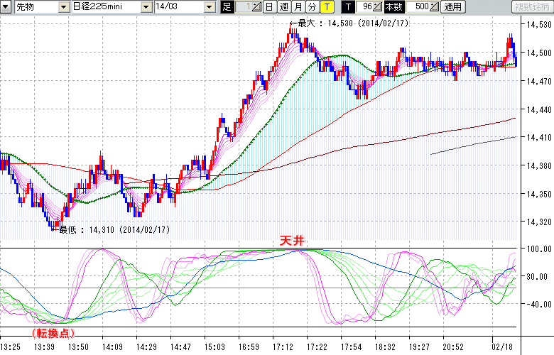 2014/02/18 - tensokoさんの株式ブログ。タイトル:「★2/17 夜間の株価の天井★」 本文:★2/17 夜間の株価の天井★ ↓クリックで画像拡大↓ ※指標ラインの密集点が天底・転換点を示します。指標の見方日経225mini先物チャート : 96ティック足天井 : 14530 (2/17