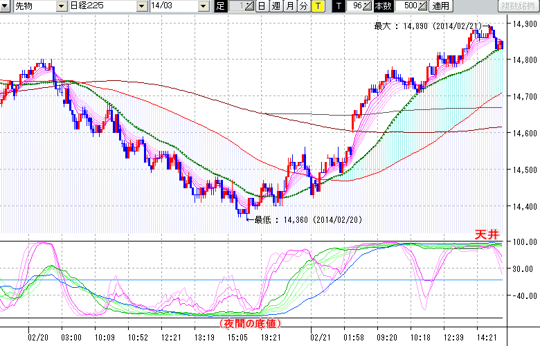 2014/02/21 - tensokoさんの株式ブログ。タイトル:「★2/21 日中の株価の天井★」 本文:★2/21 日中の株価の天井★ ↓クリックで画像拡大↓ ※指標ラインの密集点が天底・転換点を示します。指標の見方日経225large先物チャート : 96ティック足天井 : 14890 (2/21