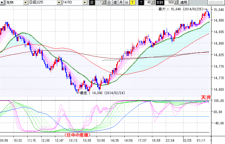 2014/02/25 - tensokoさんの株式ブログ。タイトル:「★2/24 夜間の株価の天井★」 本文:★2/24 夜間の株価の天井★ ↓クリックで画像拡大↓ ※指標ラインの密集点が天底・転換点を示します。指標の見方日経225large先物チャート : 48ティック足天井 : 15040 (2/25