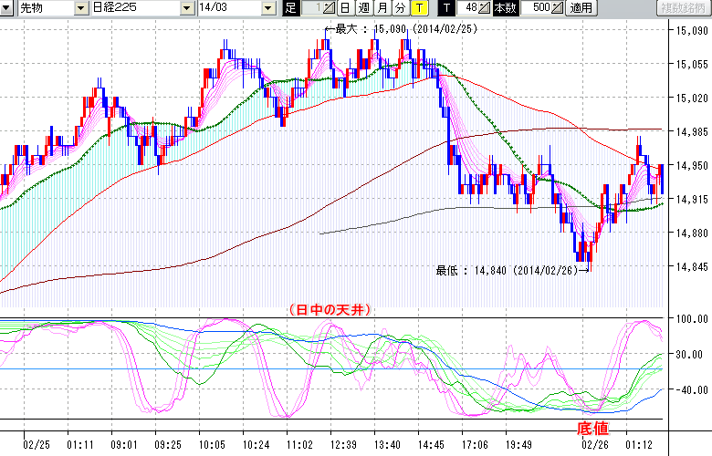 2014/02/26 - tensokoさんの株式ブログ。タイトル:「★2/25 夜間の株価の底値★」 本文:★2/25 夜間の株価の底値★ ↓クリックで画像拡大↓ ※指標ラインの密集点が天底・転換点を示します。指標の見方日経225large先物チャート : 48ティック足底値 : 14840 (2/28