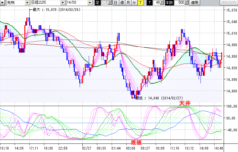 2014/02/27 - tensokoさんの株式ブログ。タイトル:「★2/27 日中の株価の天底★」 本文:★2/27 日中の株価の天底★ ↓クリックで画像拡大↓ ※指標ラインの密集点が天底・転換点を示します。指標の見方日経225large先物チャート : 48ティック足底値 : 14840 (2/27