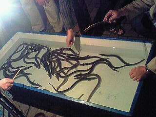 色々なものを飲み食いしすぎて胃が辛くなった後、一行はうなぎすくいに興じました。(写真右)