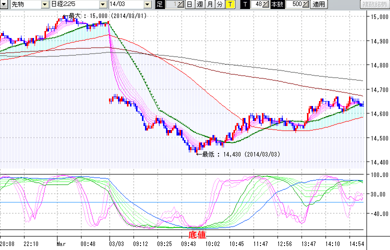 2014/03/03 - tensokoさんの株式ブログ。タイトル:「★3/3 日中の株価の底値★」 本文:★3/3 日中の株価の底値★ ↓クリックで画像拡大↓ ※指標ラインの密集点が天底・転換点を示します。指標の見方日経225large先物チャート : 48ティック足底値 : 14430 (3/3