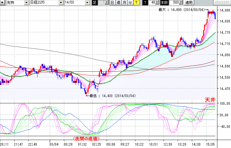 2014/03/04 - tensokoさんの株式ブログ。タイトル:「★3/4 日中の株価の天井★」 本文:★3/4 日中の株価の天井★ ↓クリックで画像拡大↓ ※指標ラインの密集点が天底・転換点を示します。指標の見方日経225large先物チャート : 48ティック足天井 : 14890 (3/4