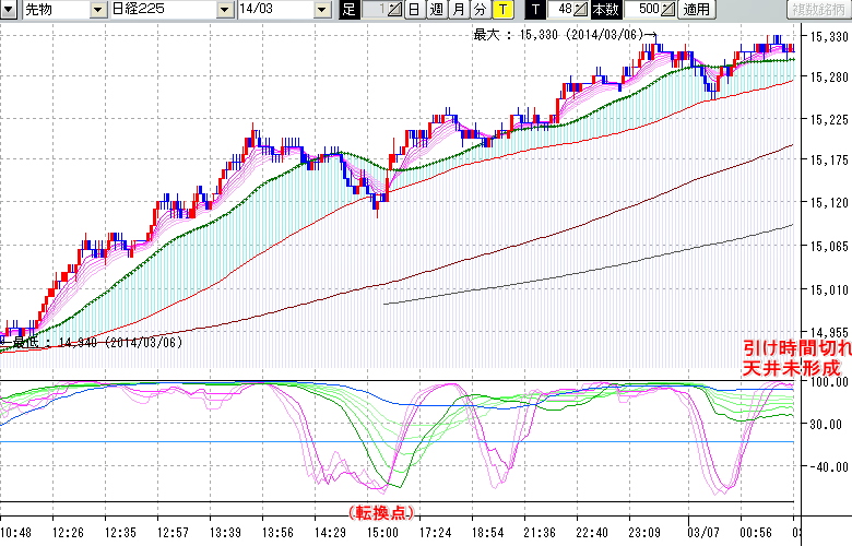 2014/03/07 - tensokoさんの株式ブログ。タイトル:「★3/6 夜間の株価の天井★」 本文:★3/6 夜間の株価の天井★ ↓クリックで画像拡大↓ ※指標ラインの密集点が天底・転換点を示します。指標の見方日経225large先物チャート : 48ティック足天井 :