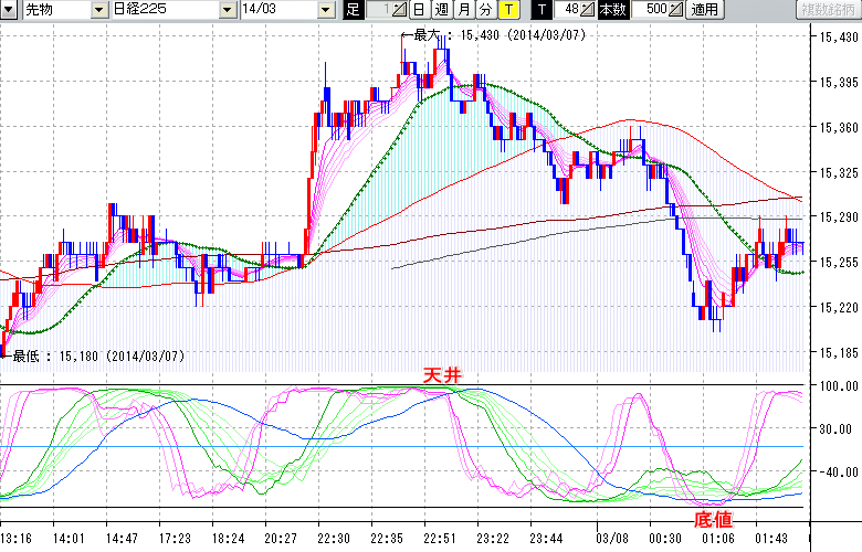 2014/03/08 - tensokoさんの株式ブログ。タイトル:「★3/7 夜間の株価の天底★」 本文:★3/7 夜間の株価の天底★ ↓クリックで画像拡大↓ ※指標ラインの密集点が天底・転換点を示します。指標の見方日経225large先物チャート : 48ティック足天井 : 15430 (3/7
