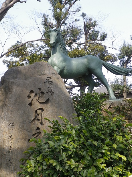 その昔、宇治川の先陣争いで佐々木高綱が乗ったという名馬「池月」の像があります。この辺の産だとか。