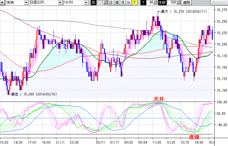 2014/03/11 - tensokoさんの株式ブログ。タイトル:「★3/11 日中の株価の天底★」 本文:★3/11 日中の株価の天底★ ↓クリックで画像拡大↓ ※指標ラインの密集点が天底・転換点を示します。指標の見方日経225large先物チャート : 48ティック足天井 : 15270 (3/11