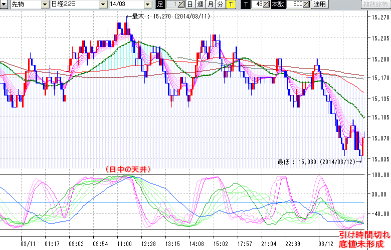 2014/03/12 - tensokoさんの株式ブログ。タイトル:「★3/11 夜間の株価の底値★」 本文:★3/11 夜間の株価の底値★ ↓クリックで画像拡大↓ ※指標ラインの密集点が天底・転換点を示します。指標の見方日経225large先物チャート : 48ティック足底値 :